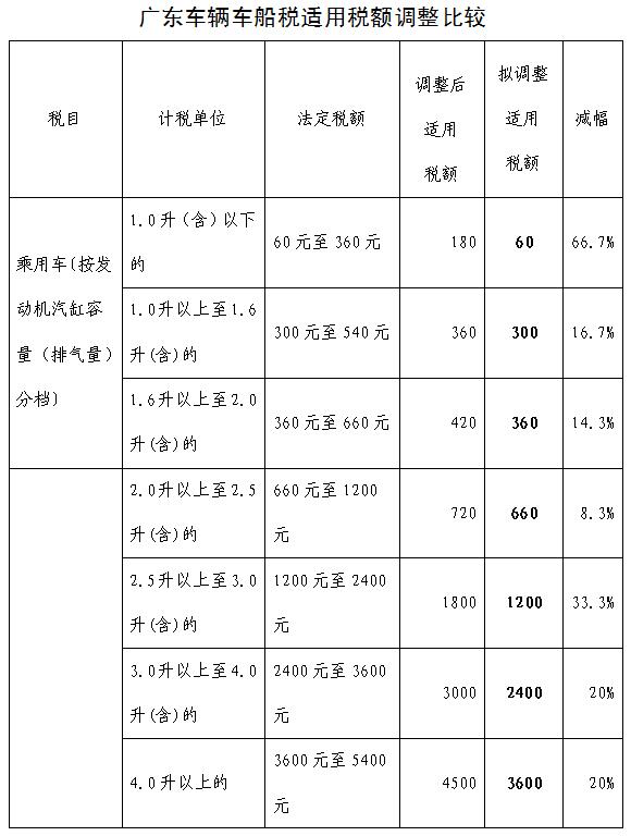 为推进供给侧结构性改革,进一步降低税负,《广东省人民政府关于降低制造业企业成本支持实体经济发展若干政策措施》(粤府〔2017〕90号)提出,“在国家规定的税额幅度内,将车辆车船税适用税额降低到法定税率最低水平”。粤府〔2017〕103号文,明确车辆车船税各子税目适用税额降低到车船税法规定税额的下限(详见下表)。