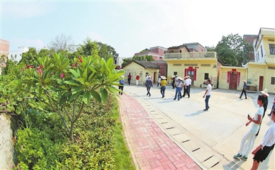 干净整洁漂亮,这是走进郁南县河口镇河口寨村最直观的印象。平整且较宽阔的村道,旁边铺设了红色透水砖的人行道;人行道边,绿草如茵,花团锦簇,绿树成荫带来惬意的清凉(如图)。村庄就在河口圩镇附近,环境比圩镇还要“稍胜一筹”。乡村振兴、脱贫攻坚,让这条省定贫困村变得魅力非凡。