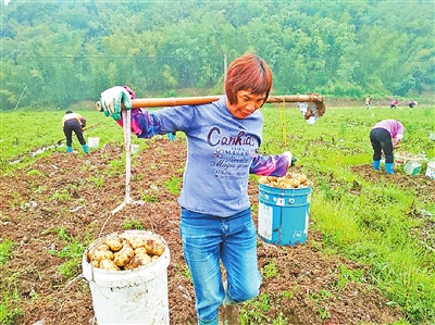 笔者在位于上六村委下坑村的马铃薯基地看到,不少农户正奔波于田间地头,忙碌着抢收马铃薯,并将挖起的马铃薯进行分拣、称重,准备装车发货(如图)。