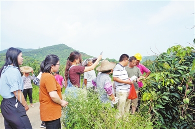 在金煌芒种植基地里,来自广东省农业科学院果树研究所的专家博士现场为农户传授金煌芒种植技术,深入浅出地讲授肥水管理、蔬果促果、果子套袋、防虫病害等方面知识。针对农户在种植过程中遇到的金煌芒果皮有结疤、黑斑、花点等问题和技术盲点,进行重点讲解和提供有效的解决方法、措施。当天虽然天气炎热,却丝毫没有影响农户们的热情,学习兴趣浓厚,认真聆听讲课。授课专家也顶着烈日耐心讲解,不落下任何一个细节,边讲解边示范技术要领。同时,还与农户交流互动,现场解答农户提出的疑问,为他们排忧解难。