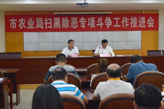 7月20日,市农业局召开扫黑除恶专项斗争工作推进会,市农业局、市畜牧兽医渔业局、市扶贫办、市渔政支队全体人员,市农产品检验检疫中心、市农机监理所、市种子管理站、市动物卫生监督所、市农业科学及技术推广中心主要负责人共70人参加。副局长初云宝同志总结我局上半年扫黑除恶专项斗争工作情况,市委农办主任、市农业局党组书记、局长陈雄荣同志对下半年全局扫黑除恶专项斗争工作作重要发言。