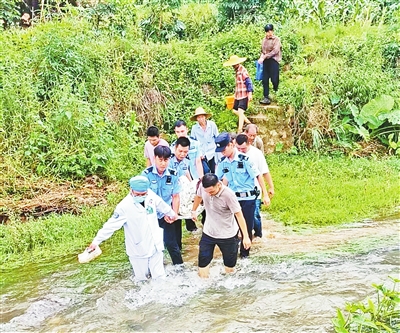 节日期间,市公安局云安分局高村派出所接到群众求助称:一群众在山上被马蜂蜇伤,需要紧急救治。接报后,值班民辅警立即赶往现场并联系医护人员一同救援。由于事发山路崎岖,只能徒步攀爬前往,到达现场后发现伤者身上多处被蜇伤且出现头晕乏力、红肿症状,已经出现半昏迷状态。情况紧急,现场民警与群众同心轮流托举伤者下山,经过半小时跋山涉水,成功将伤者送往医院救治。