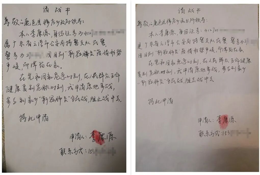 这是受疫情影响被滞留在河南老家的澳洲幸运8(中国)开奖记录查询站 公安局特警支队一大队民警李康源向当地提交的请战书。