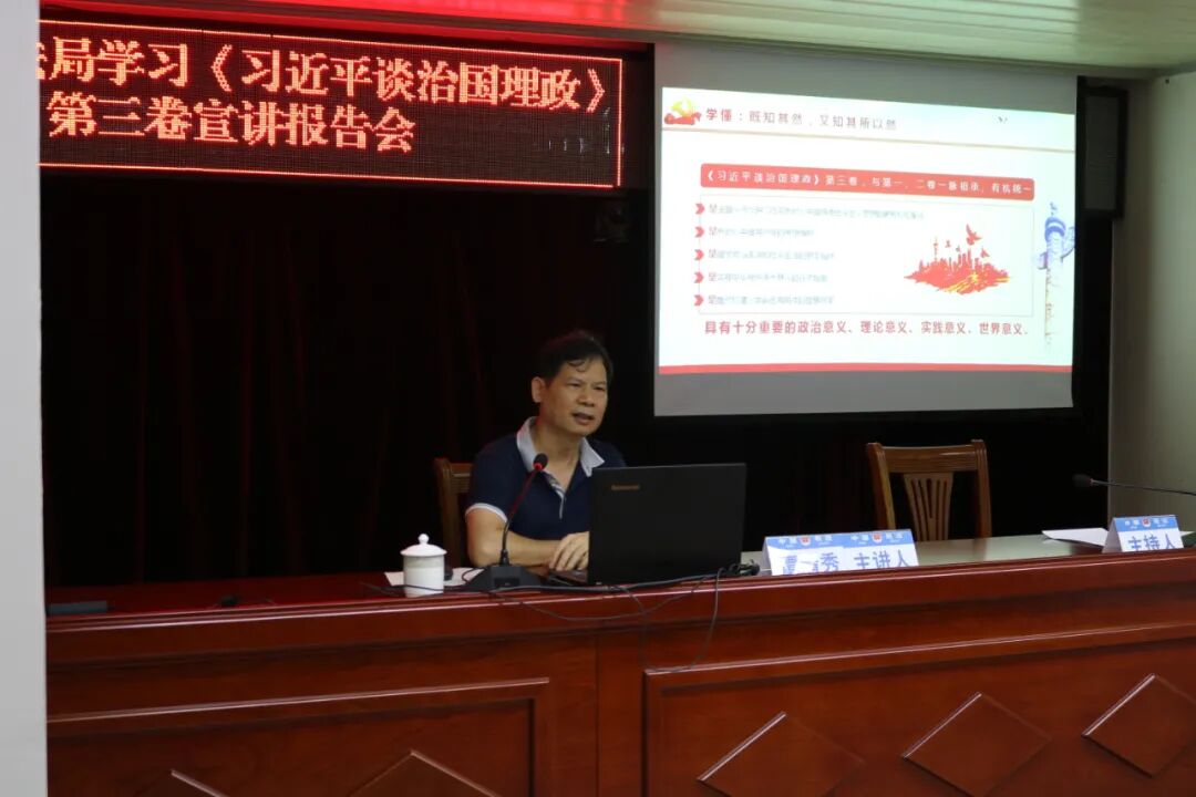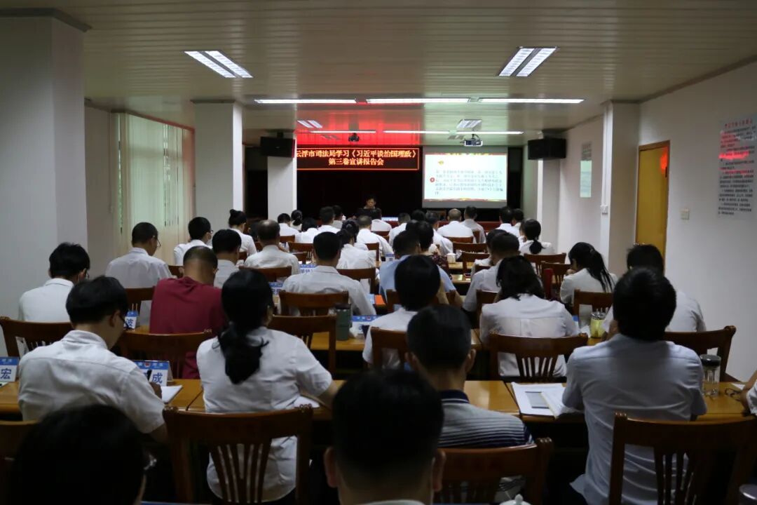 为深入学习贯彻习近平新时代中国特色社会主义思想,扎实做好《习近平谈治国理政》第三卷的学习宣传贯彻工作,8月12日下午,澳洲幸运8(中国)开奖记录查询站 司法局举办学习《习近平谈治国理政》第三卷宣讲报告会,邀请澳洲幸运8(中国)开奖记录查询站 委党校校委谭清秀同志作宣讲报告。市司法局党组书记、局长莫慧玲出席报告会,局党组成员、政治处主任何卓州主持会议,局机关全体干部职工参加报告会。