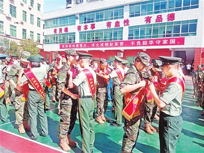 当天上午,在雄壮的国歌声中,即将奔赴军营的新兵们和退役士兵军容严整、英姿飒爽、队列整齐,相关人员为退役士兵佩戴“光荣返乡 梦想起航”绶带。随后,宣读新兵入伍命令,颁发入伍通知书,勉励新兵们信守入伍誓言,牢记家人嘱托,不负家乡人民的期望,扎根军营、刻苦训练、勇毅向前、永不言弃。退役士兵为入伍新兵佩戴“一人参军 全家光荣”绶带和大红花,全体新兵面向军旗高举右拳,庄严宣誓,表达新兵们参军入伍、报效国家的赤诚情怀。