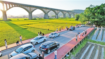 秋日里,长岗坡渡槽下游人如织(如图),村民忙碌地售卖本地特产。据悉,节假日期间,日游客量最高达2万人,带动罗平镇餐饮、住宿业火爆。渡槽附近村民售卖土特产、饮料、小食日收入超千元。