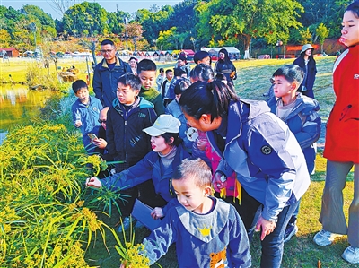 活动以“沉浸式科普+互动实践”为主线展开。上午9时,孩子们在工作人员引导下首先参观湿地科普展板区,通过图文并茂的展板了解湿地“地球之肾”的生态功能及西宁湖湿地生物多样性。在随后开启的“食物链游戏”环节,孩子们化身生态小卫士,通过角色扮演理解湿地生态系统能量流动规律;有奖问答环节更是掀起高潮,孩子们踊跃举手抢答问题,在趣味互动中深化生态认知。在“湿地实地探索”环节,讲解员带领亲子家庭沿西宁湖步道徒步,沿途讲解湿地的生态特征,并引导观察积雪草、落羽杉、风车草等典型湿地植物。