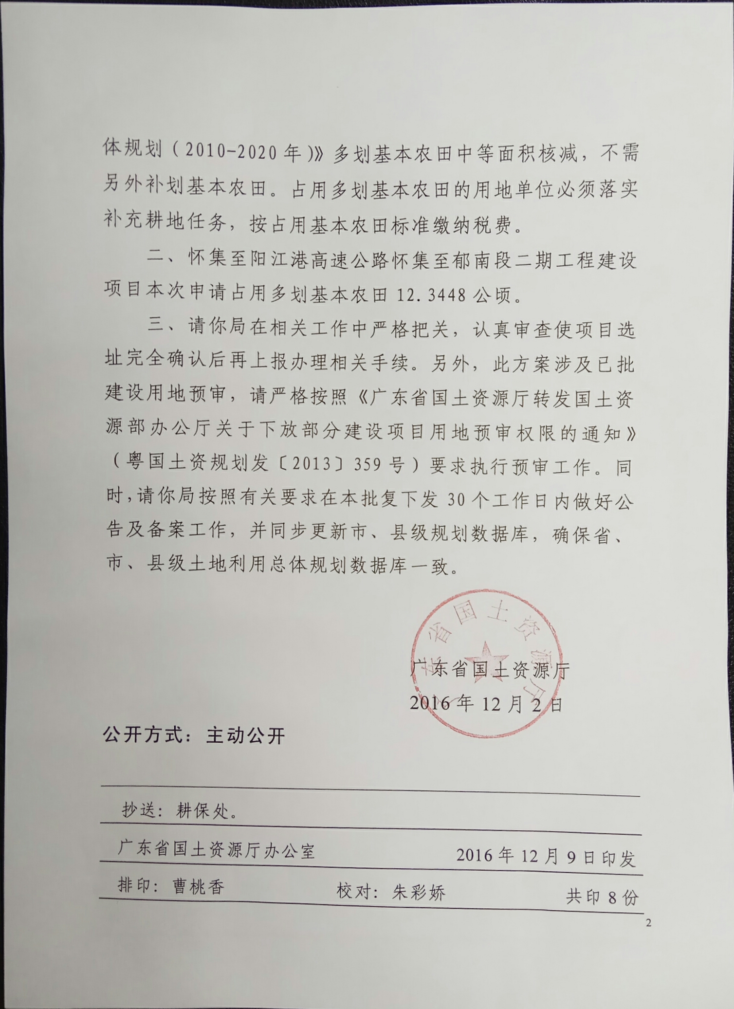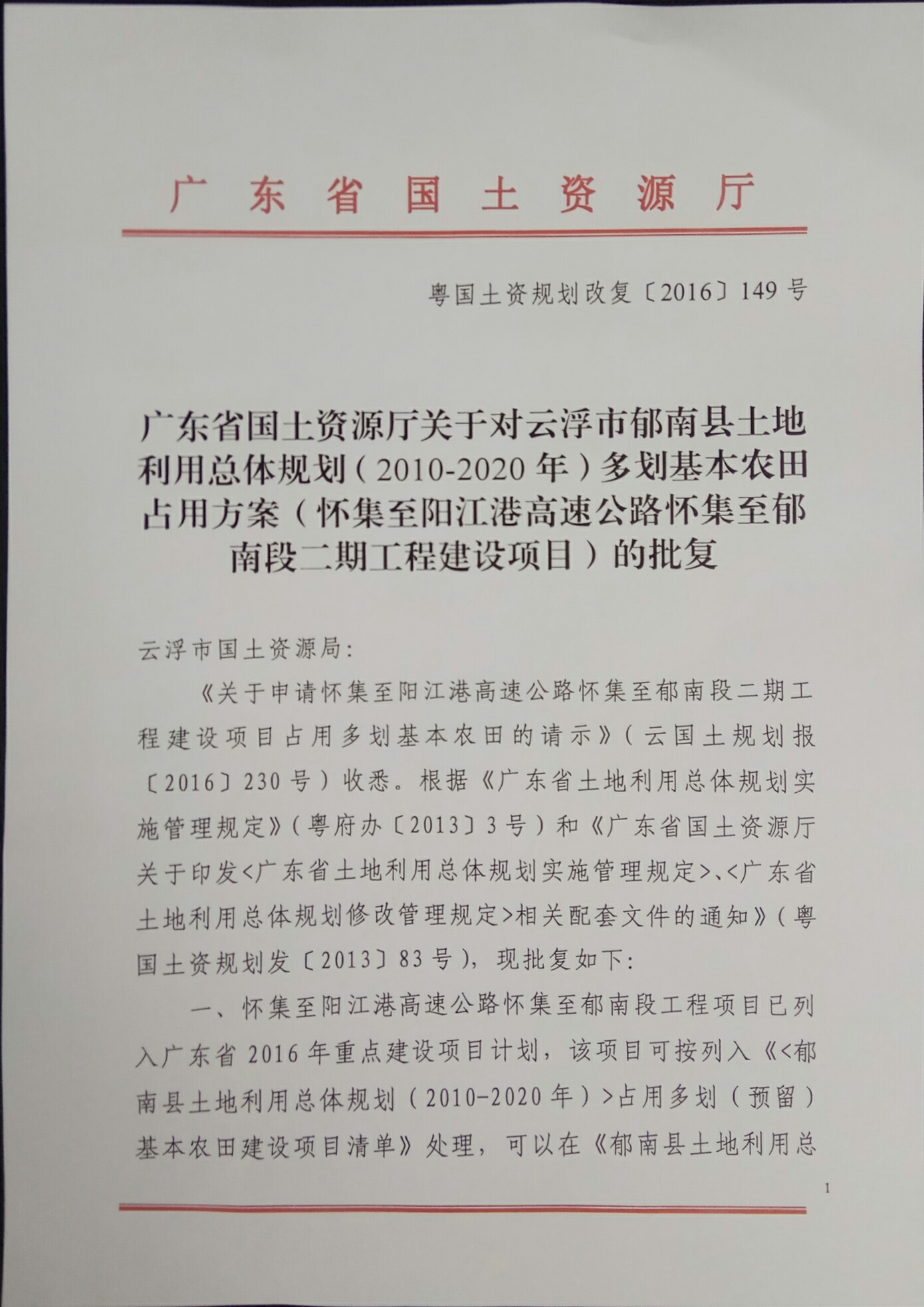 怀集至阳江港高速铁路郁南段二期占用多划基本农田批复